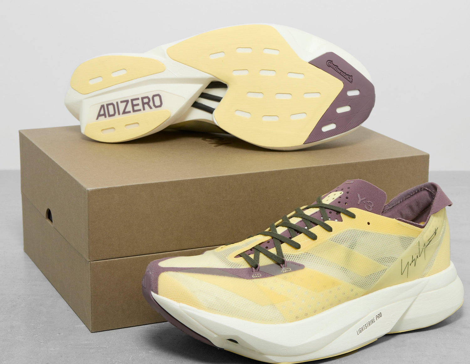 Taking its lead from its adidas counterpart, the adidas Y-3 Adios Pro 3.0 was built for racing and next-level speed. Created from part recycled materials, the breathable 'Almost Yellow' upper is emblazoned with 'Shadow Fig' 3-Stripes and features a Y-3 woven tag. Below, carbon-infused ENERGYRODS 2.0 provides a lightweight stiffness that delivers propulsive energy return to your stride, while LIGHTSTRIKE PRO - two layers of responsive foam - enhances your long-distance experience. | IH0868 | 715694