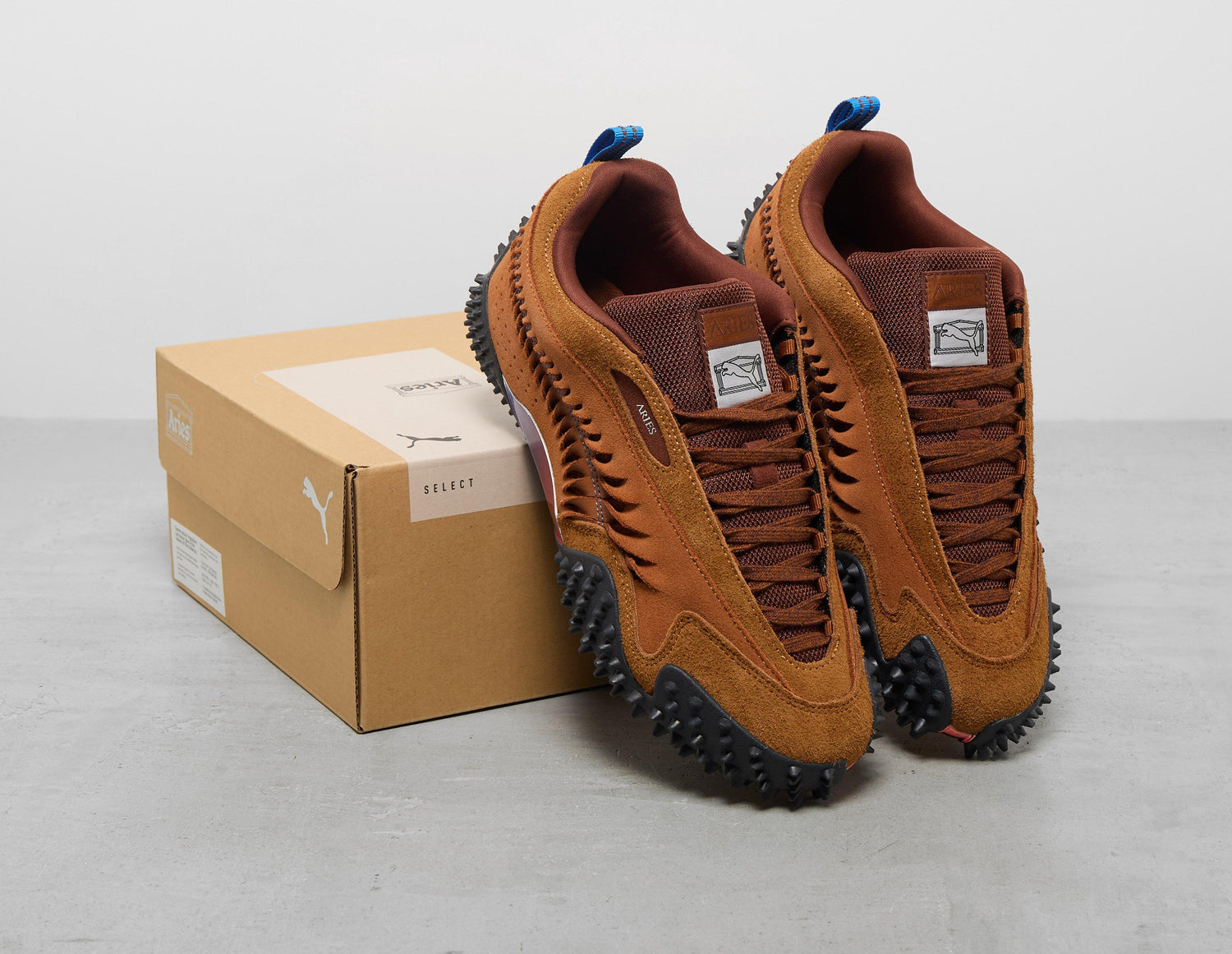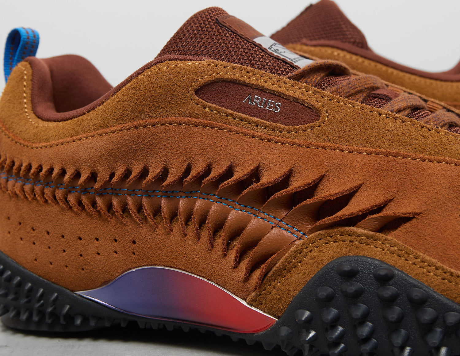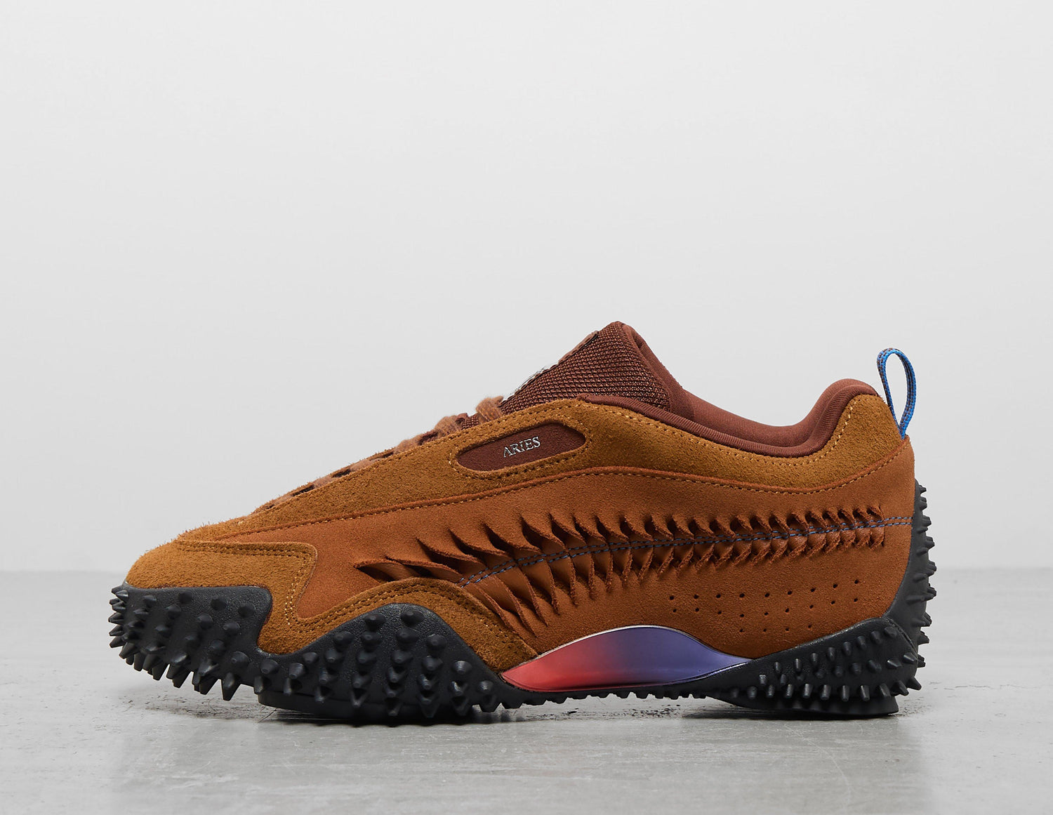 PUMA s'associe à la marque streetwear londonienne Aries pour une nouvelle collection qui met en lumière l'athlétisme intense du Muay Thaï et le frisson des jeux de combat classiques. Ici, la tige luxueuse en daim « Mahogany » de la Mostro Craft arbore un Formstip revisité avec des détails en forme de branchies, tandis que le co-branding sur l'ensemble du modèle fait un clin d'œil à la collaboration. Sous le pied, les crampons Mostro emblématiques surgissent de la semelle, tandis qu'un empiècement brillant et irisé brille au milieu du pied.