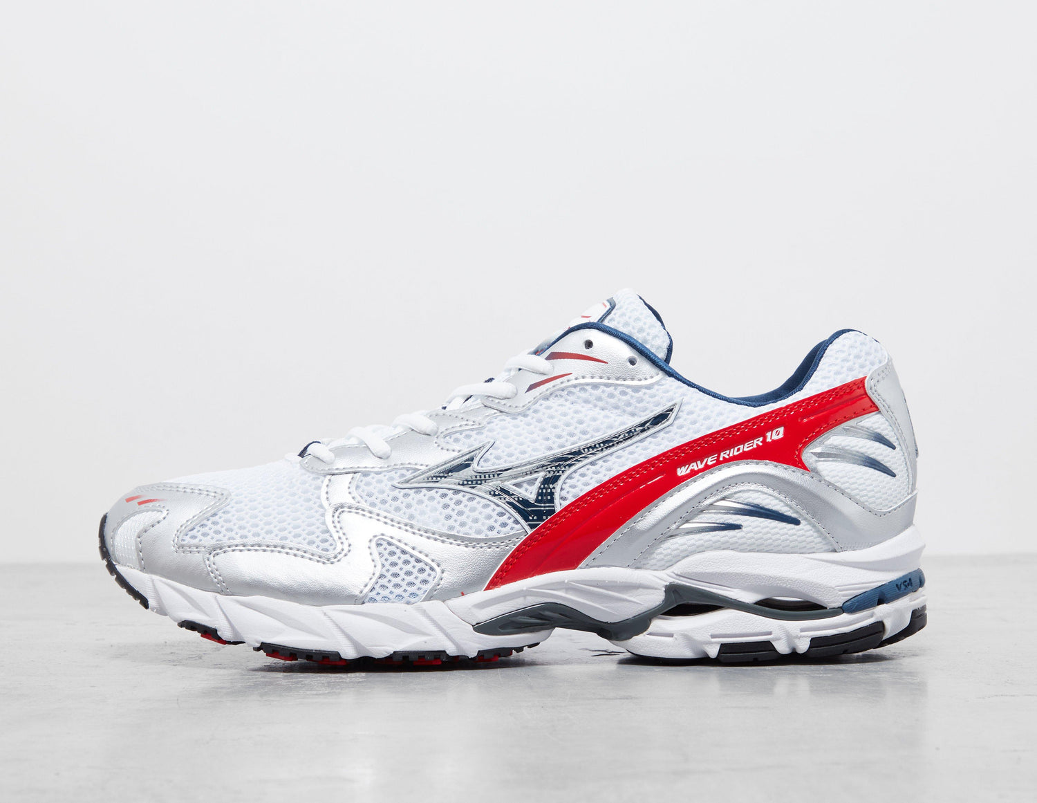 One of the greats and making one of its many appearances this year, the Mizuno Wave Rider 10 returns with another futuristic colour up. Airy mesh and metallic leather overlays working in tandem on the upper, delivering depth and breathability to its predominantly white, silver and red construction. RunBird inscribed sidewalls add that touch of brand history, whilst Mizuno tag branding adds further embellishment to the tongue and heel. Wave technology buries itself between the midsole and outsole, supplying a cushy stride with each step, while underfoot, the rubber outsole carries the fit with some grippy tread. | D1GA210408 | 631169