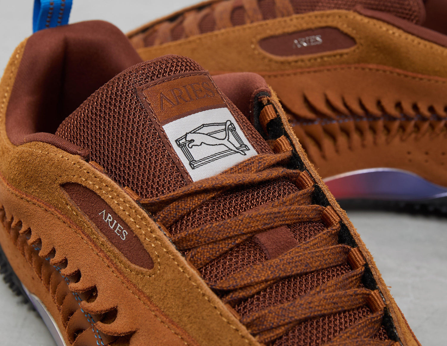 PUMA teams up with London streetwear label Aries on a new collection that spotlights the charged athleticism of Muay Thai and the thrill of classic fighting games. Here, a luxe 'Mahogany' suede upper on the Mostro Craft features a reimagined Formstip with gill-like detailing, while co-branding across the design nods to the collaboration. Underfoot, signature Mostro spikes creep up from the sole unit, while a glossy iridescent panel shines out from the midfoot