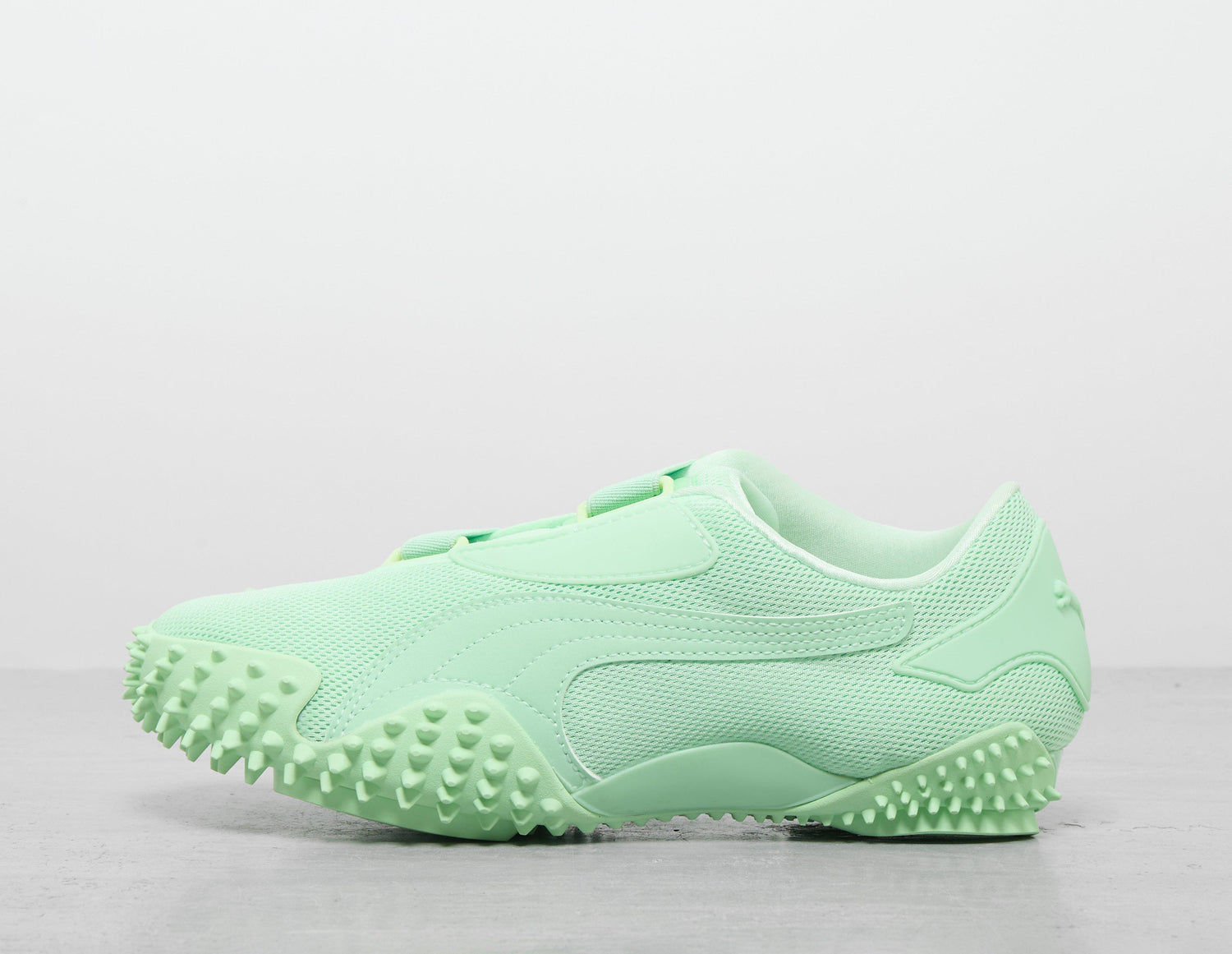 PUMA expands its Mostro line up with the Mostro Ecstasy, which arrives in a complete 'Fresh Mint' outfit. A breathable mesh base coats the upper, while the distinctive elasticated hoop and loop closure system provides a firm foothold. Below, the green-hued spiked midsole offers a signature Mostro aesthetic, and a textile Formstrip completes the design. | 397328_07 | 750060