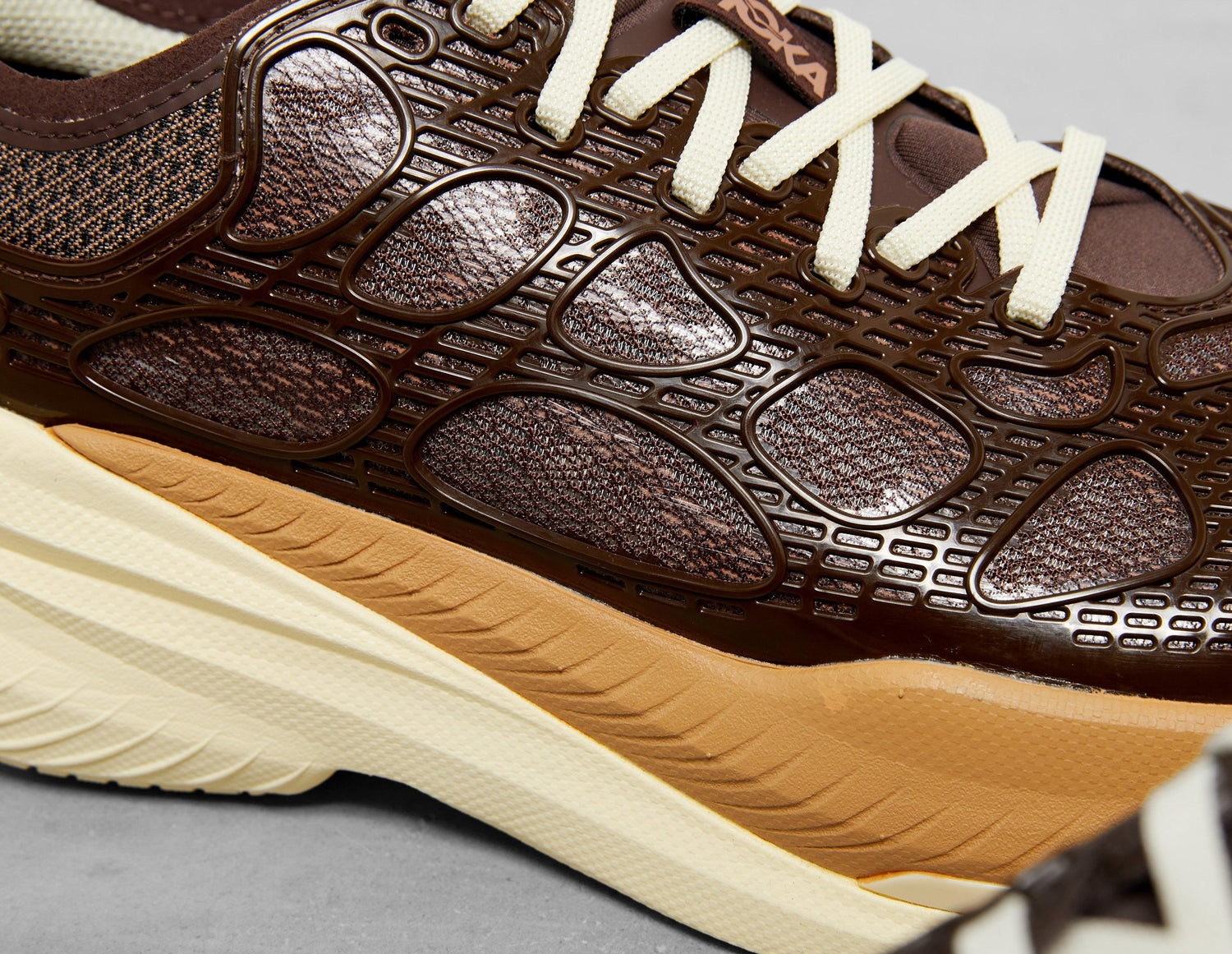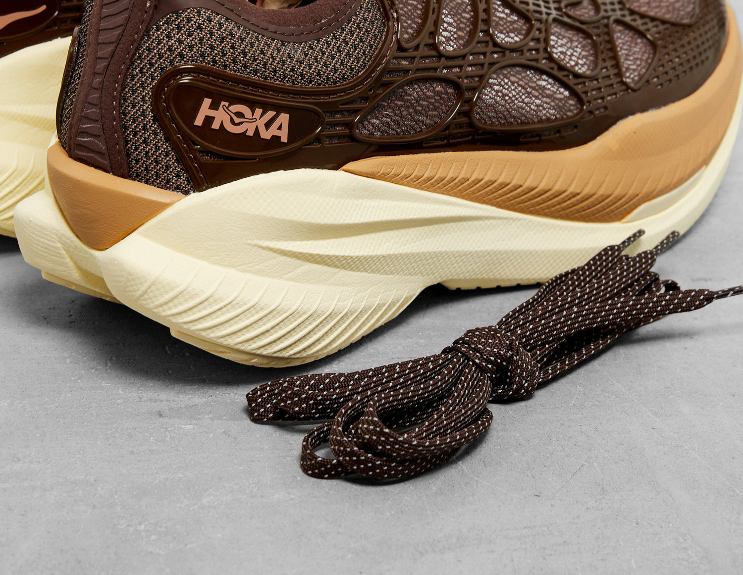 Adding to its roster of runners, HOKA releases its Mach X Caged in 'Walnut' and 'Maple'. Borrowing tooling from the Mach X 2, uppers are decked out with mesh underlays and a flow-moulded TPU cage. A Pebax Plate propels take-offs and PEBA foam cushions landings, while below, a durable outsole with a traction lug maximises ground contact to keep you steady on terrain. HOKA branding and reflective hits sign off the design. | 1168932-WNTM | 760612