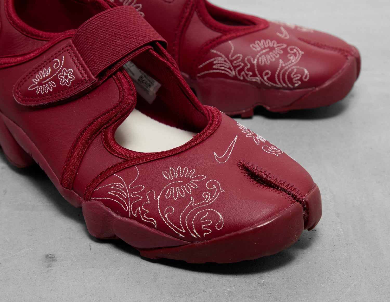 Nike's Air Rift arrives in a red leather upper decorated with a 'Botanical Stitch', boasting its signature features of a hook-and-loop closure and the infamous split toe. Cloud-like Air cushioning delivers pure comfort to each step, and underfoot, the unique traction pattern encourages a natural flow of motion across terrains. | IH7318-677 | 763704