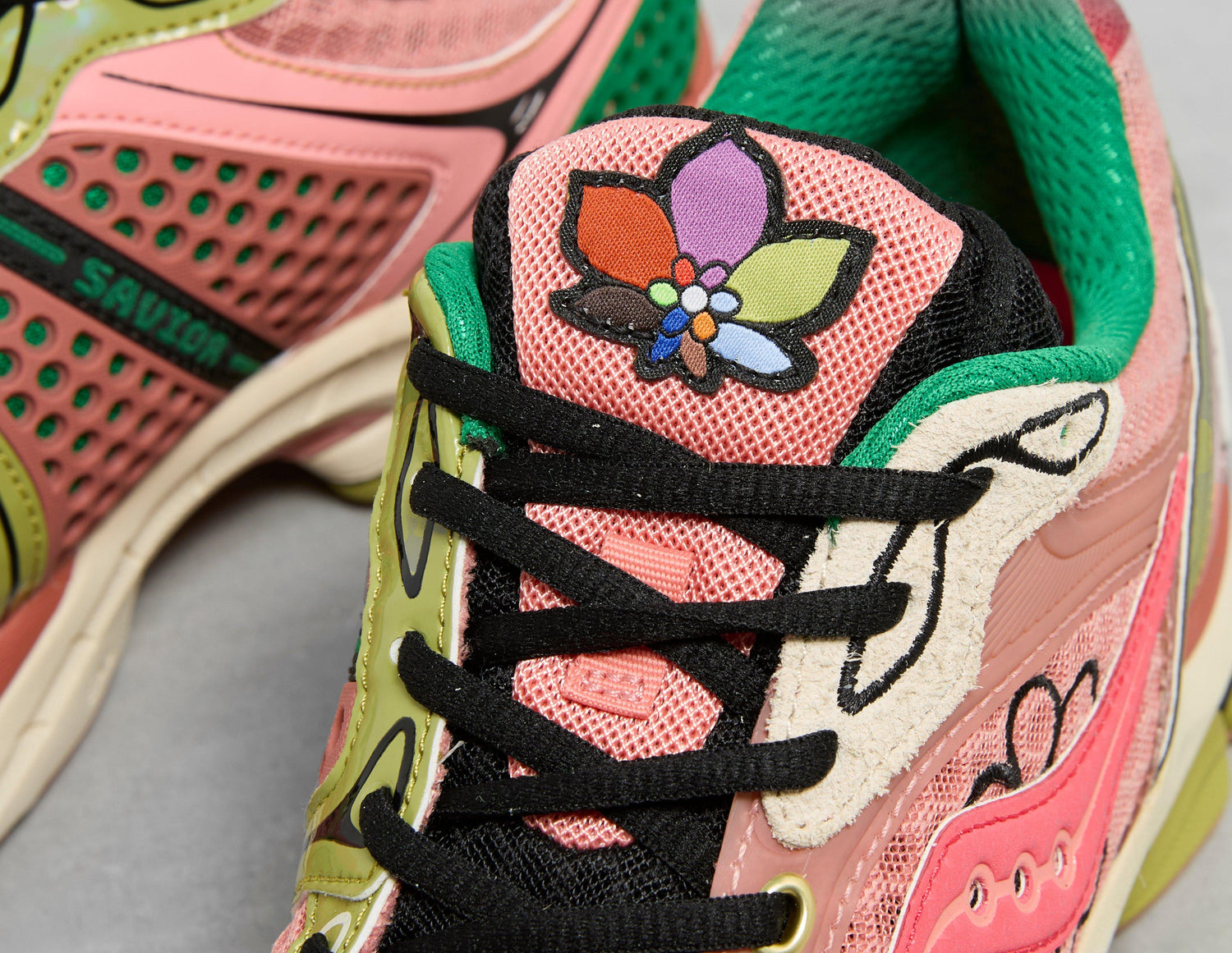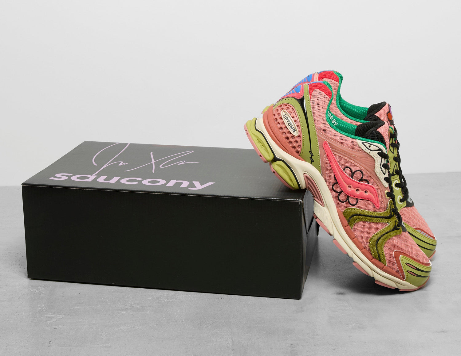 Marking his 6th collection with Saucony, Bronx-born Jae Tips turns his unique lens on the ProGrid Triumph 4 for the 'Flowers Grow Uptown' pack. Inspired by NYC flora, this iteration is coined 'Virginia Creeper' - a soft pink upper is layered with breathable mesh, green patent panelling, hairy suede and TPU heel counters. Below, the retro runner is grounded by an off-white, green and pink sole unit, while 'Made By Jae Tips' embroidery signs things off on the inner. | S70966-2 | 786617